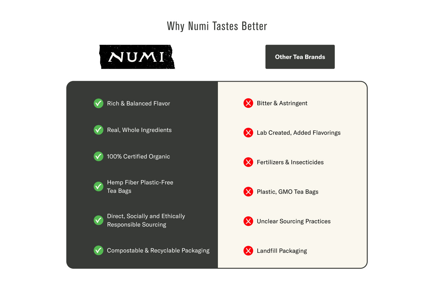 Numi’s tea bag wrappers* are commercially compostable (ASTM D6868 compliant/3rd party certification in progress). They are made from sustainably grown FSC® certified paper, and lined with sugarcane-based Non-GMO PLA and metalized eucalyptus layers to ensure freshness. Our plant-based wrappers have been tested to make sure they completely disintegrate and cause no eco-toxicity when they break down. You can compost the wrappers with any municipal or industrial service that accepts green waste (throw them in your green can). Unfortunately, due to the compostable freshness lining, the wrappers are not recyclable.